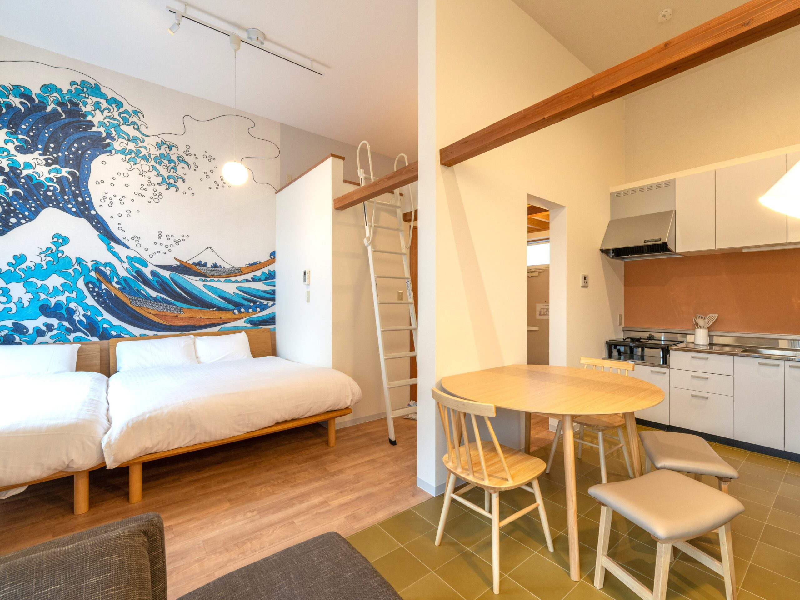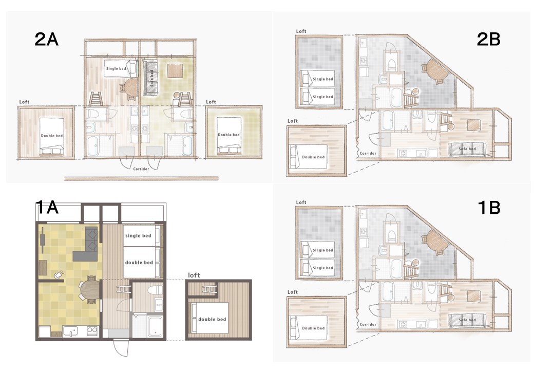 1~2階で4タイプのユニットに分かれ、居心地の良いロフト、簡易キッチン、フルバスルームが備わっています。